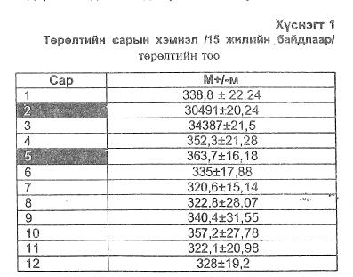 Эхний хагас жилд төрсөн эх (339.6±9.81) сүүлийн хагас жилийнхээс (331.85± 23.8) яльгүй олон байна. Гэвч үнэн магадтай ялгаа илэрсэнгүй.