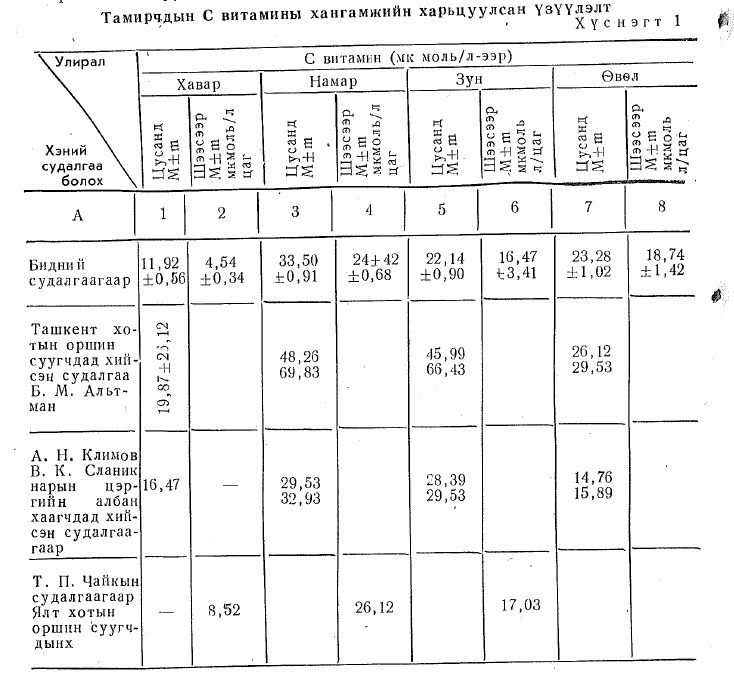 1. Тамирчдын С витамииы хангамж жилийн аль ч улиралд физиологийн нормоос (Зөвлөлтийн судлаачдын тогтоосон) доогуур байлаа. Ялангуяа хаврын улиралд бүр ч бага байв.