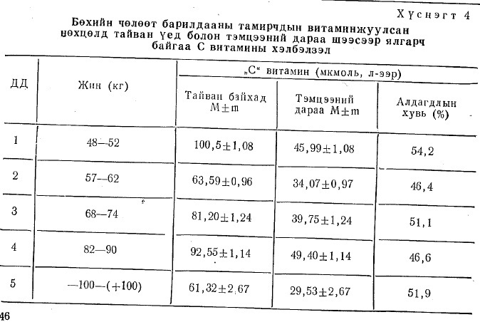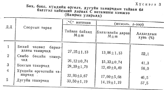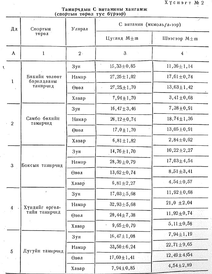 Хүснэгтээс харахад жилийн аль ч улиралд тамирчдын С витамины хангамж Зөвлөлтийн эрдэмтдийн гаргасан нормоос доогуур байна. (Цусанд 39,75—68,14, шээсээр 34,07—56,78 мкмоль/л)