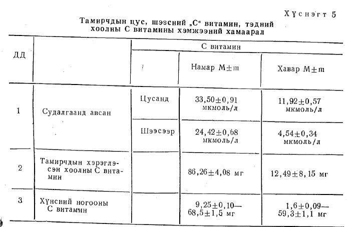 5. Тамирчдын С витамины хангамжийг судалж байгаатай холбогдуулан тэдний хэрэглэж байсан хоолны С витаминыг хавар, намрын улиралд судлан дүнг 5 дугаар хүснэгтээр үзүүлэв.