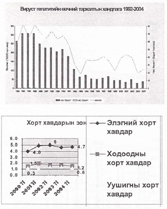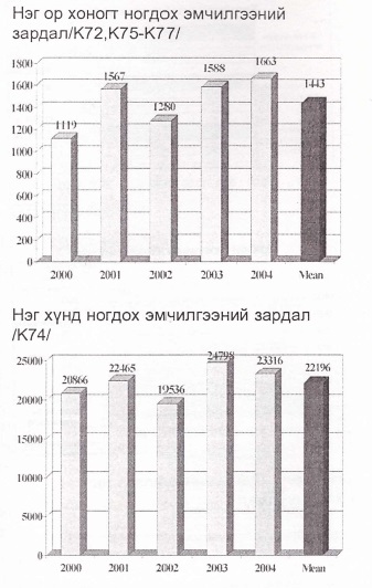 * Насны байдлаар авч үзвэл элэгний өвчлөл 20-44 насанд 30.9%, 45-64 насанд 41.9% -г эзэлж байна.