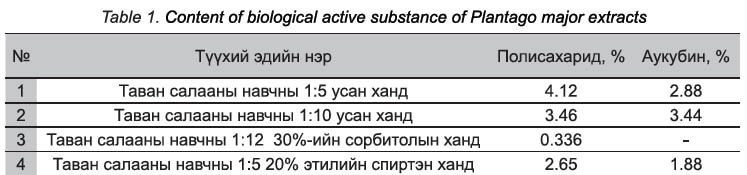 Many anti cough formulations that are contains Plantago majus sold in pharmaceutical market. For example: Herbion, Pectoral manufactured by KRKA, Naturwaen and Mepha, respectively. The aim of this study determination of aucubin and biological active substances in Plantago majus that is growth commonly in Mongolia. The result of this study, Plantago majus leaves are estabilished polysaccharide 4.66%. Leaves of Plantago majus has been extracted by water(1:5), water (1:10), 30 % sorbitol and 20% ethanol, then determination aucubin and polysaccharide. The results, polysaccharide was 4.12%, 3.46%, 0.336% and 2.65%, respectively. Aucubin was 2.88%, 3.44%, not determined 30% sorbitol extract and 1.88%, respectively.