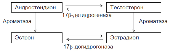 Андростидионоос эстрон, тестостероноос эстрадиол, 16-гидрокси-уламжлалаас нь 16-окси-эстрон, мөн эстриол үүсдэг [33, 34, 24].