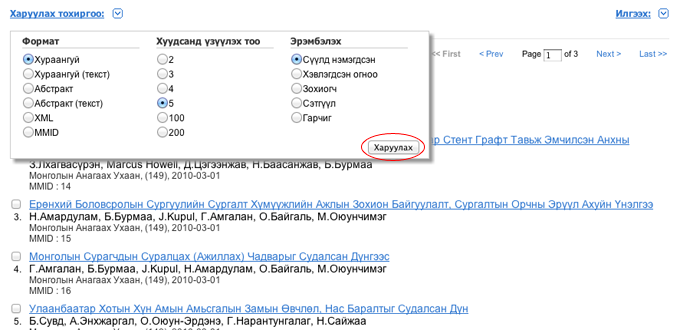 Нийтлэлүүдийн жагсаалтын баруун дээд хэсэгт байрлах "Илгээх" дээр дарахад жижиг цонх гарч ирнэ. Энэ цонхноос нийтлэлүүдийн жагсаалтыг и-мэйлээр илгээх, өөрийн ном зүй үүсгэж эсвэл түр хадгалах болон файл хэлбэрээр татан авах боломжтой. Ямар форматаар болон эрэмбээр мөн хэдэн нийтлэл илгээх тохиргоог хийх боломжтой. |